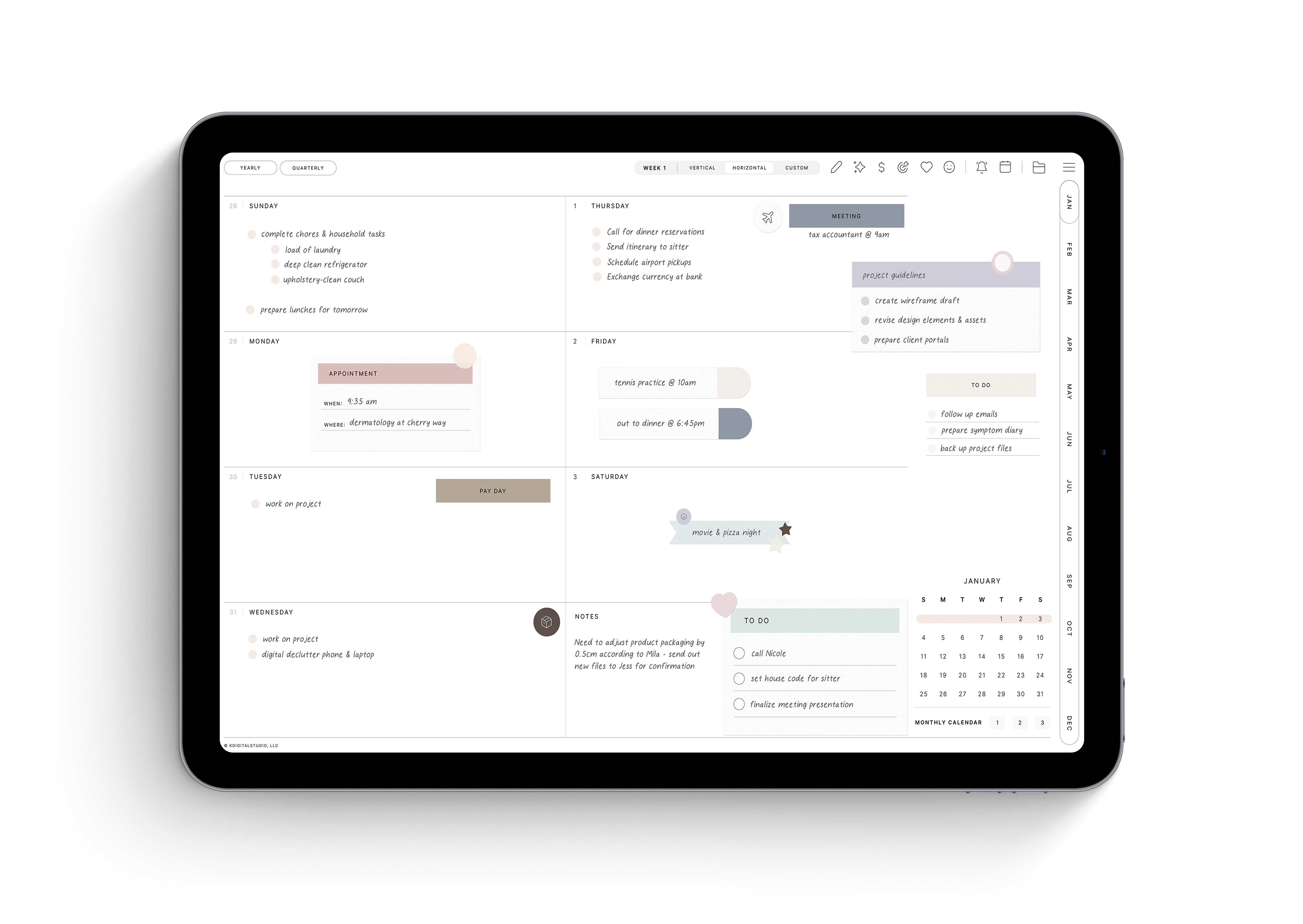 Set reminders, schedule events, and create alerts without ever having to leave your digital planner. Compatible with Apple and Google Calendar, and Apple Reminders.