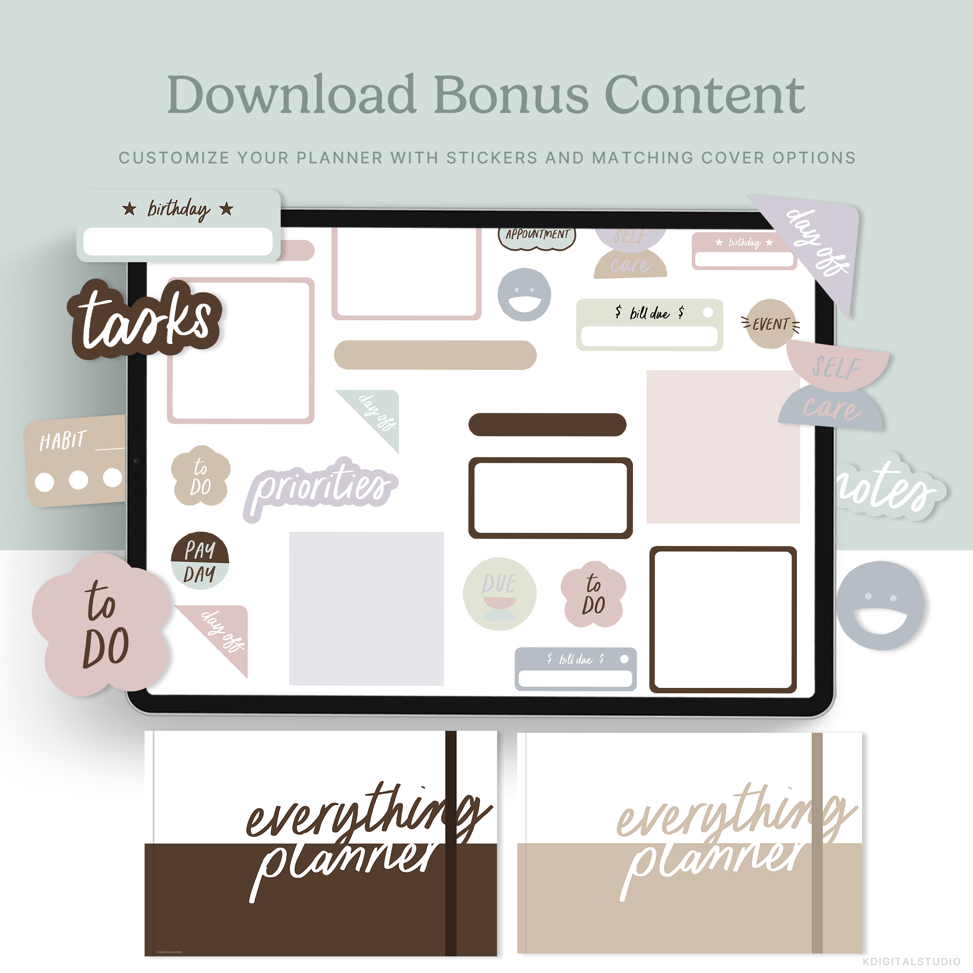 We always provide a Sunday start and Monday start version of the planner for you to choose the week start you prefer after purchase. We often include a curated selection of digital stickers and planner covers to add to the experience.