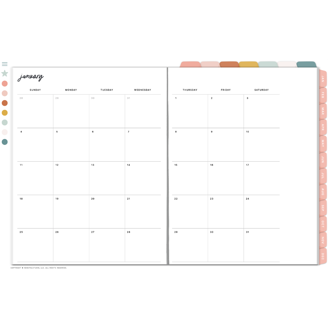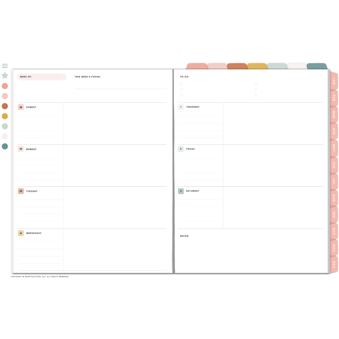 A hyperlinked, PDF digital planner created to handle anything life throws your way! Whether you're tracking new habits, planning future goals, running a business, or traveling the world, this planner will be your fun & festive companion.