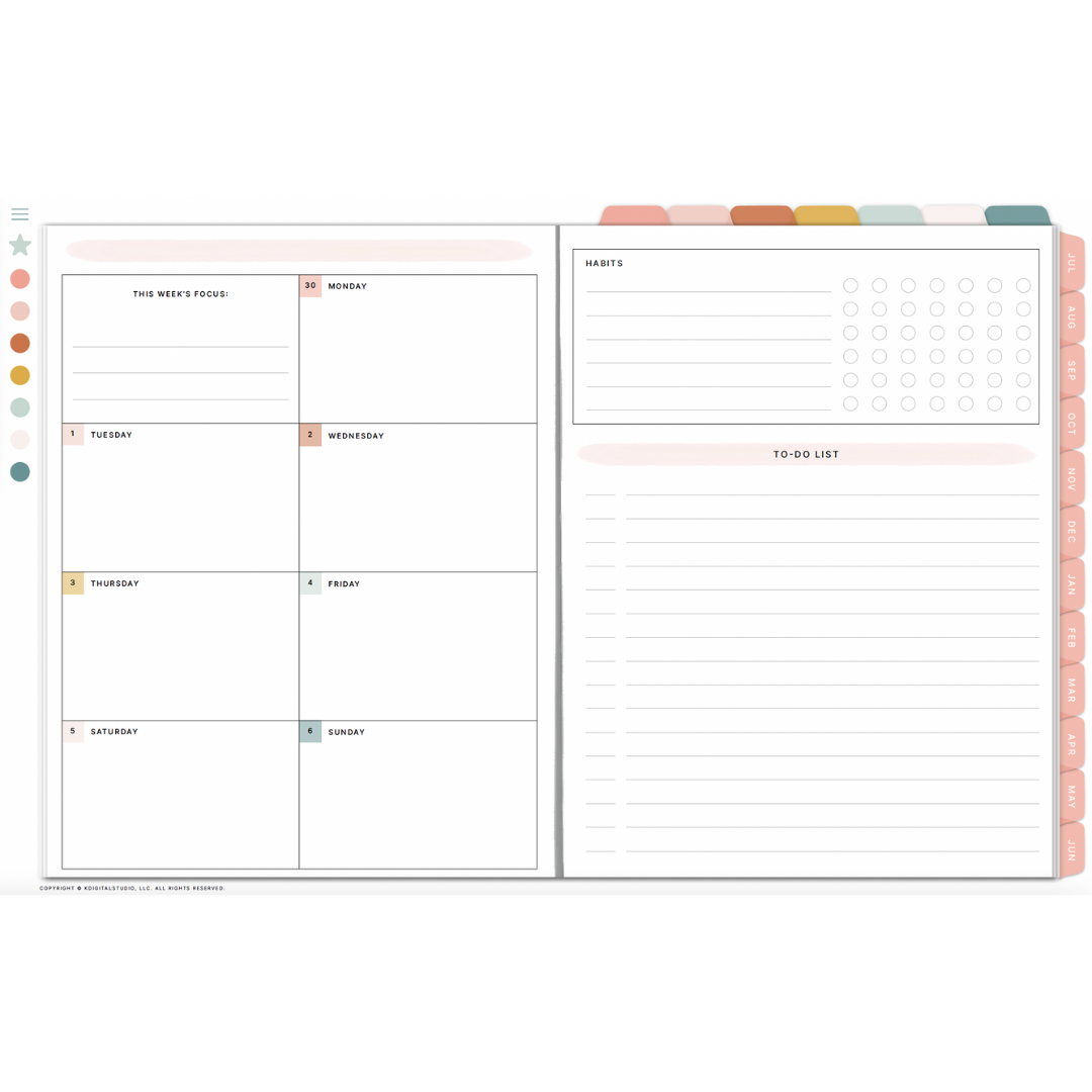 A hyperlinked, PDF digital planner created to handle anything life throws your way! Whether you're tracking new habits, planning future goals, running a business, or traveling the world, this planner will be your fun & festive companion.