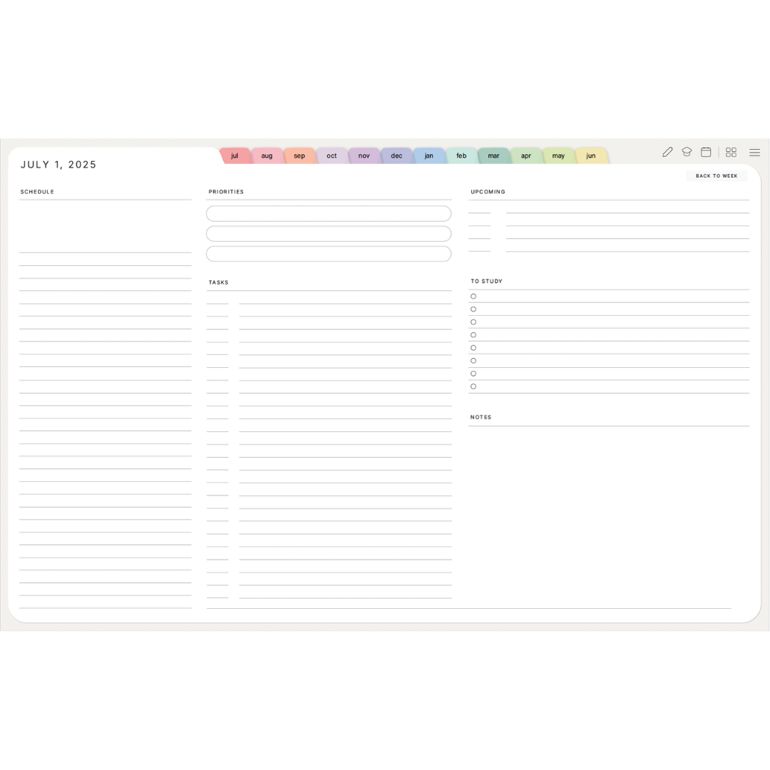 A hyperlinked, PDF digital planner created for students and academic life! Whether you're tracking your study sessions, planning essays, preparing meals for the week, or taking notes, this planner will be your companion for the school year.